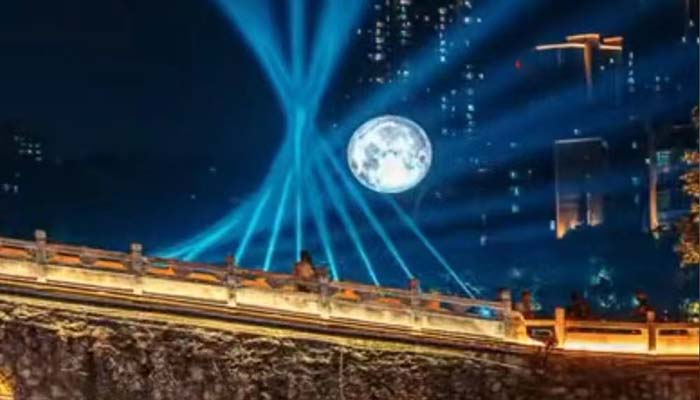 月亮升降裝置設(shè)置于郴州北湖湖中的島上,用于在夜間表現(xiàn)“明月高懸”的美麗景觀。該裝置主要由支撐結(jié)構(gòu)、戶外LED網(wǎng)格屏、升降裝置、電氣控制、支撐柱基礎(chǔ)組成。戶外LED網(wǎng)格屏夜間顯示月亮圖案,可通過升降裝置提升到26米的高度,呈現(xiàn)出月亮當(dāng)空懸掛的效果,展示完畢后,可通過卷揚(yáng)系統(tǒng)將LED屏降至地面。該項目由我公司設(shè)計制作,目前已投入?yún)⑴c演出,得到廣大觀眾的認(rèn)可,喜愛。